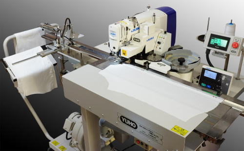 紳士用、婦人用の2個の光電センサーが、素材端を自動検知し、第一ボタンの位置からボタンの間隔、ボタンの穴数を高精度に割り出し、ボタン付けを行います。紳士用は右から左に送り、婦人用は左から右へ送られ、スタッカー装置により完璧な積み重ねを行います。又、第一ボタンの位置をミシン押え下にセットすれば、即縫いスター トでの運転も可能。